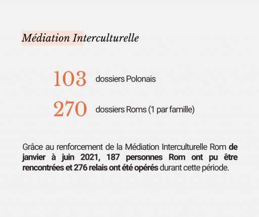 Les médiatrices interculturelles de l’équipe de DIOGENES ont été fortement sollicitées en 2021. Cela se voit dans les chiffres (270 dossiers actifs pour des familles Rom et 103 dossiers actifs pour des habitants de la rue Polonais), mais la pénurie de médiateurs interculturels dans le secteur se fait également ressentir sur le terrain. Souvent, nos deux collègues étaient appelées pour un simple service de traduction, ce qui n’est pas l’objectif de leur travail et imposait donc une réflexion. L’année 2021 fût une année de structuration pour la médiation interculturelle au sein de DIOGENES.